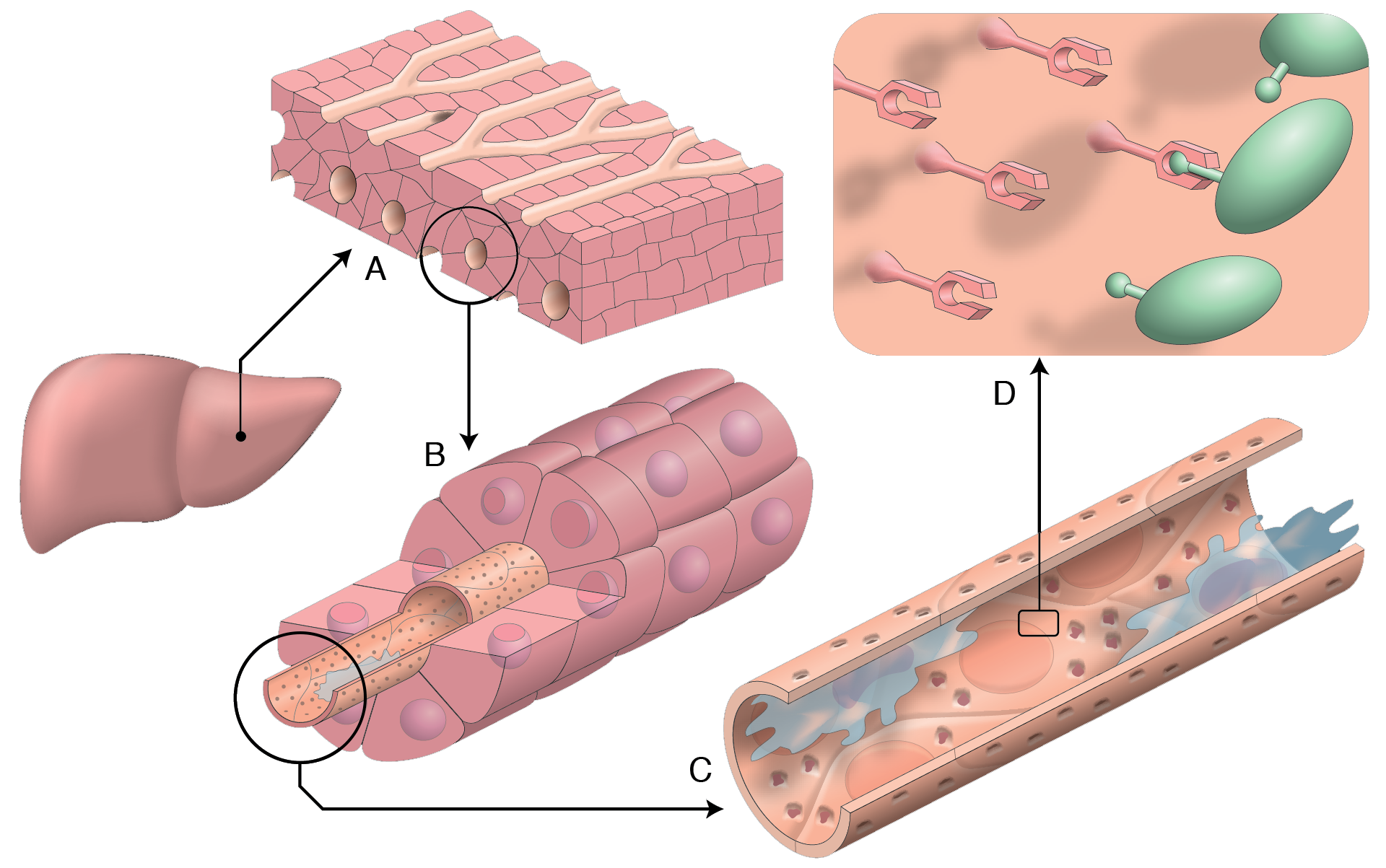 D: At this submicroscopic magnification clearance receptors on the LSEC surface are shown. One of the receptors has bound a blood borne compound (green) in order to clear it from the circulation (also clearly shown above, in Animation 2). The next event (not shown here) is rapid receptor internalization into the LSEC cell body, bringing the bound compound to the interior of the LSEC to be metabolized.